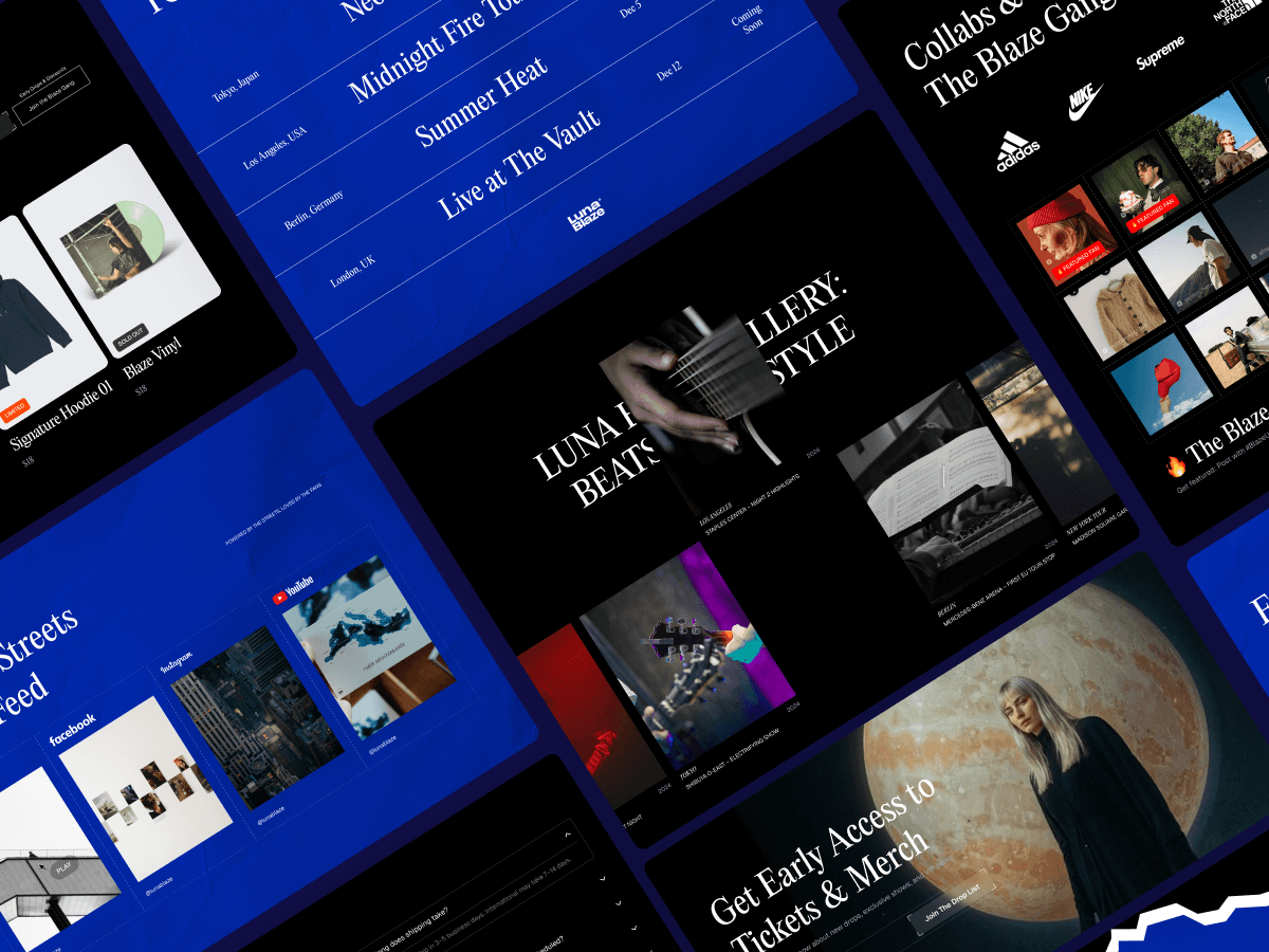 A high-energy artist website designed for merch drops and tour experiences. Built with bold visuals and a live-show aesthetic, the layout connects fans directly to music, merch, and events without losing focus.